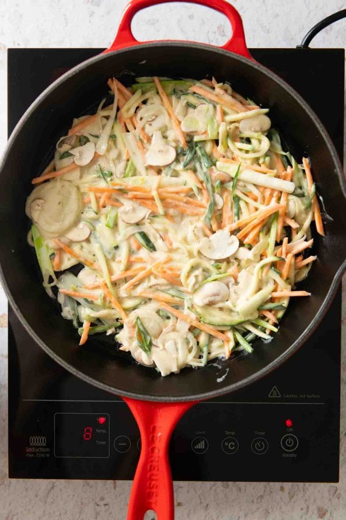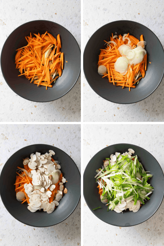 Schneide das Gemüse in sehr feine Streifen bzw. Scheiben. Am besten funktioniert das mit einer Mandoline bzw. Gemüsehobel. Karotte und Zucchini solltest du in Stifte schneiden. Meist haben Gemüsehobel dafür aber einen entsprechenden Aufsatz.
