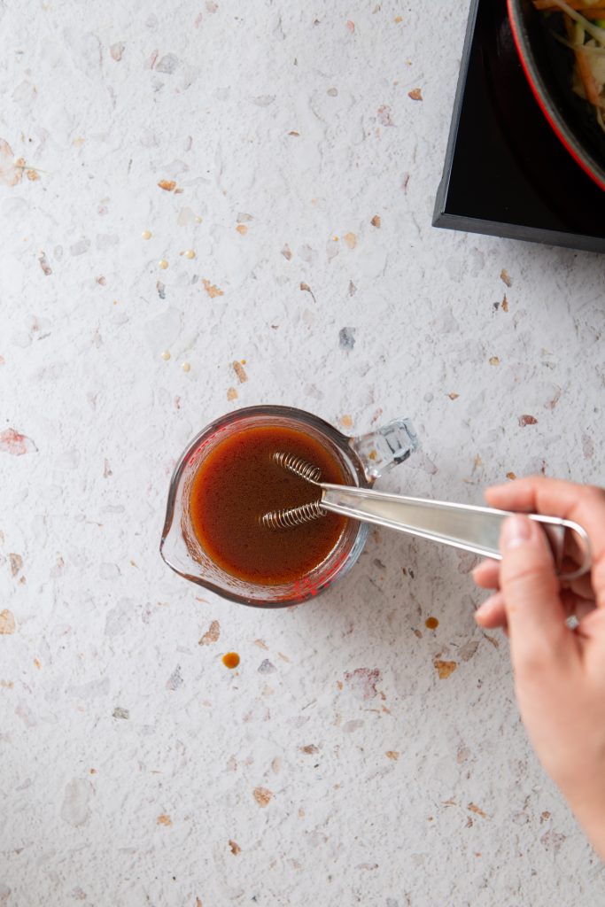 Mische, während die Koreanischen Pancakes backen die Dipsauce. Schneide den die Pancakes in Stücke, die sich gut mit Stäbchen greifen lassen und serviere Pancakes und Dipsauce solange sie warm sind.