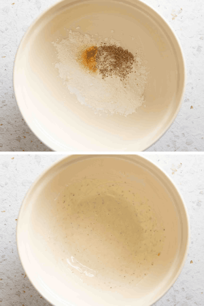 Vermenge in einer großen Schüssel Doenjang, kaltes Wasser, Mehl, Kurkuma sowie Salz und Sesam. Mische das Gemüse gründlich unter.