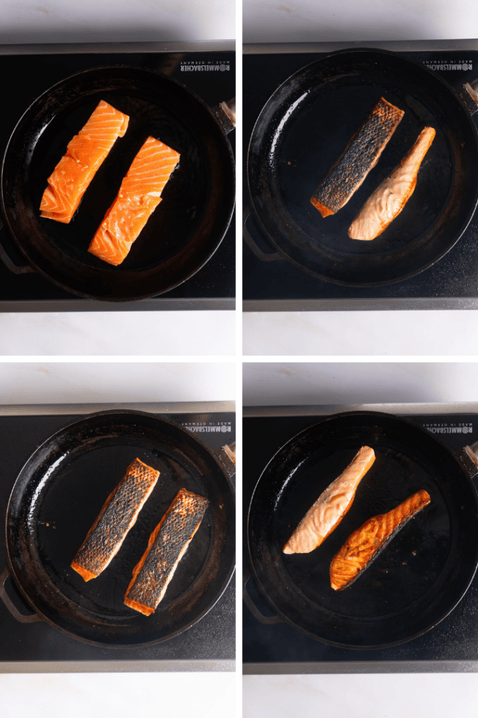Erhitze eine Pfanne und gib das Öl hinein. Brate den Lachs zunächst auf der Hautseite für 3-4 Minuten an. Wende den Lachs dann und brate ihn auf der Oberseite und bei dickeren Filets auf den Seiten für jeweils 1-2 Minuten an.