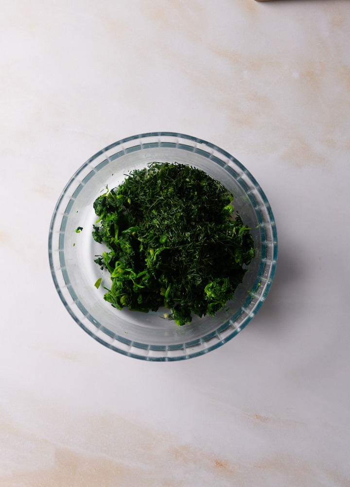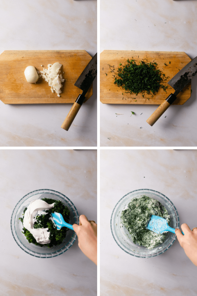 Zwiebel und Knoblauch sehr fein hacken. Zum Spinat geben. Creme Fraiche hinzufügen. Dill fein hacken. Mit Salz und Pfeffer würzen und zu einer cremigen Masse verrühren.