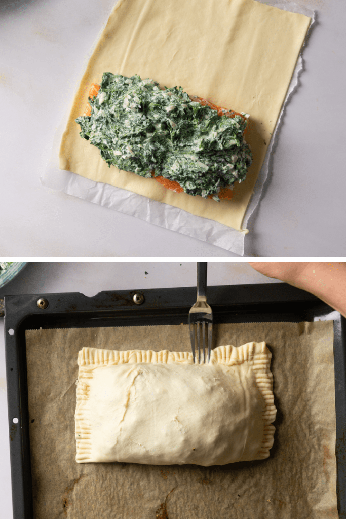Das Lachsfilet trocken tupfen. Auf eventuell Gräten abtasten und diese ggf. entfernen. Lachsfilet Waagerecht halbieren. Den Blätterteig entrollen und ebenfalls halbieren. Nun ein Lachsfilet auf die untere Hälfte eines der Blätterteigstücke legen. Die Hälfte der Spinatfüllung darauf verteilen und den Blätterteig darüber klappen. Mit einer Gabel die Ecken festdrücken.