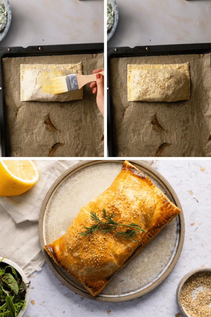Eigelb und Milch vermengen. Den Blätterteig damit einpinseln. Mit Sesam bestreuen und den Lachs im Blätterteig bei 170 °C Ober- und Unterhitze für etwa 40 Minuten backen, bis er goldbraun ist. Serviere den Lachs dann direkt aus dem Backofen mit etwas gemischtem Salat.