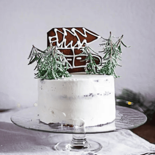 Die Torte nach dem Kühlen mit einer finalen Schicht Creme einstreichen. Torte mit dem Auto und den Rosmarienzweigen garnieren. Um die Rosmarienzweige, die unsere eingeschneiten Tannenbäume bilden, besser in die Torte stecken zu können hilft ein Schaschlikspieß.