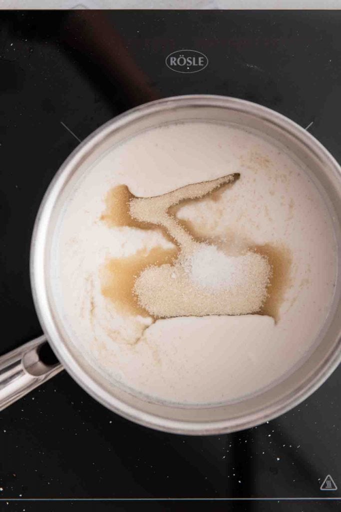 Bereite derweil den Kokosmilchsirup zu, indem du die Kokosmilch zusammen mit Zucker und Salz in einen Topf gibst und so lange erwärmst, bis der Zucker geschmolzen ist.