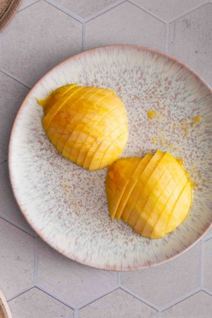 Schäle derweil die Mango und schneide die beiden Filetstücke ab. Teile sie in mundgerechte Streifen und lege sie parat.