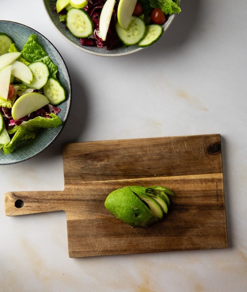 Rote Beete schälen und ebenfalls in schmale Streifen schneiden. Apfel waschen und wie die Avocado in schmale Streifen schneiden.