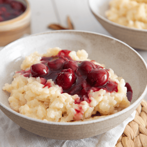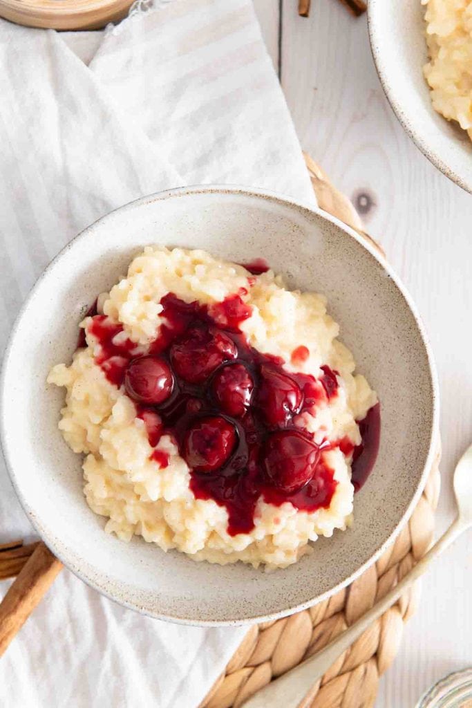 Serviere den Milchreis mit Zimt-Zucker und heißen Kirschen.