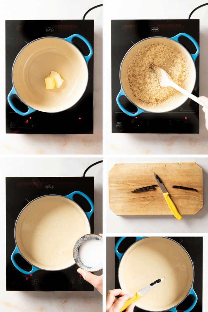 Schmilz den Butter in einem Topf und gib den Milchreis dazu. Brate den Reis kurz an, bis die Reiskörner glasig werden. Gieße dann die Milch auf. Füge Zucker und das ausgekratze Mark der Vanilleschote hinzu sowie eine Prise Salz.