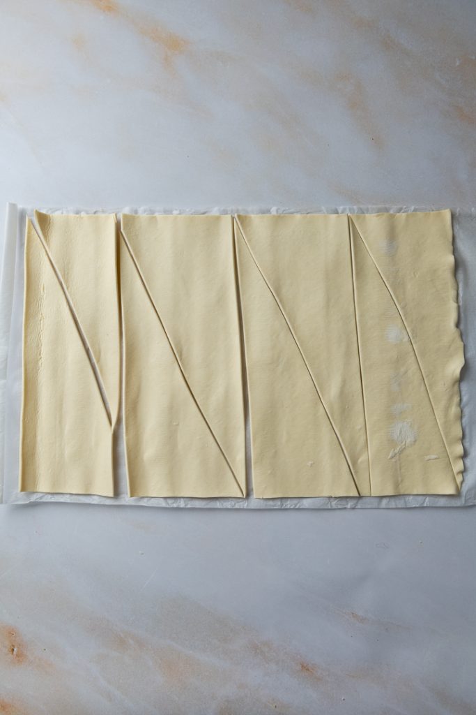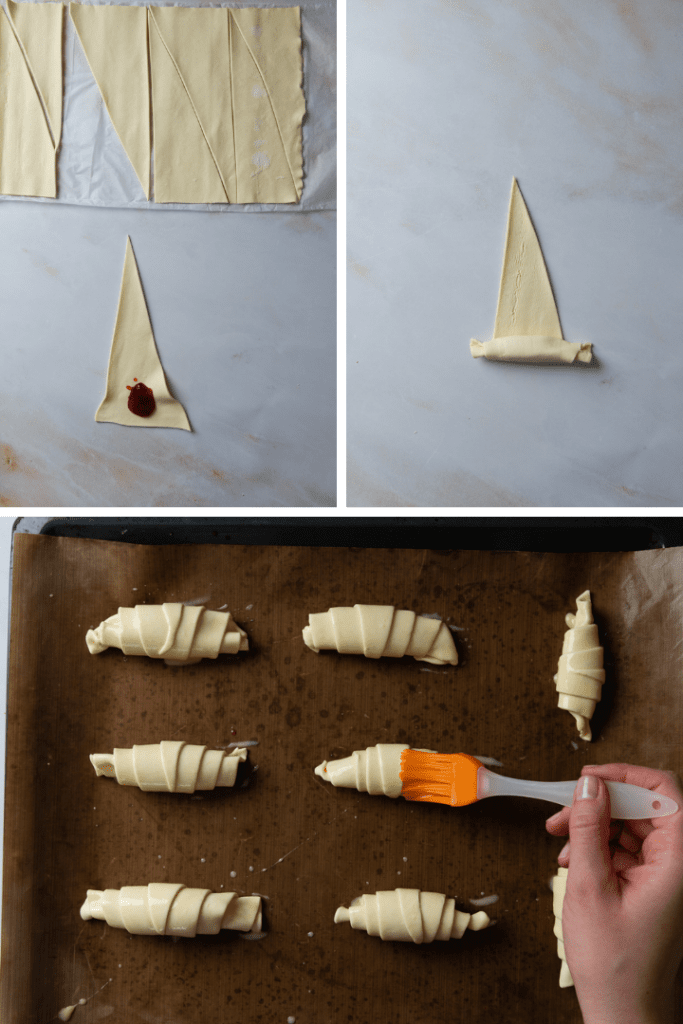 Backofen auf 170 °C Ober- und Unterhitze vorheizen. Blätterteig entrollen, in 4 gleich große Streifen teilen, diese dann diagonal halbieren, sodass 8 Dreiecke entstehen.