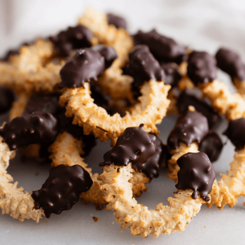 Dekoriere das abgekühlte Nuss Spritzgebäck aus dem Fleischwolf dann mit geschmolzener Schokolade.