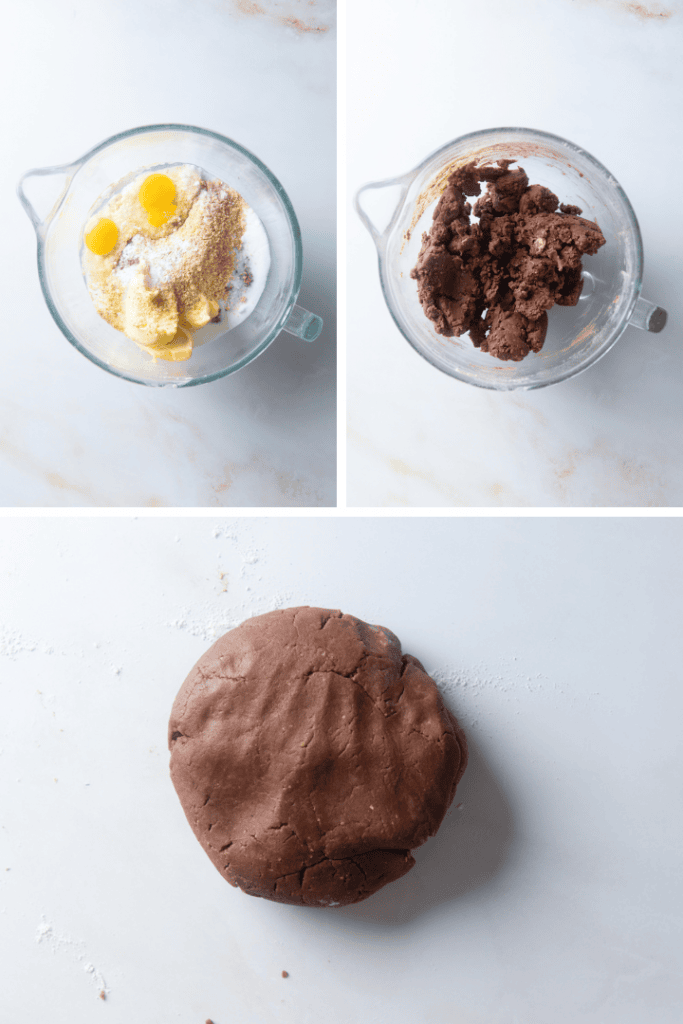 Gib 500 g Weizenmehl, 150 g Zucker, 1 TL Backpulver sowie 1 Prise Salz, 250 g Butter, 2 Eier, 30 g Backkakao und 50 g gemahlene Haselnüsse in eine große Rührschüssel und verknete sie zu einem glatten Teig. Forme den Teig zu einer Kugel und lass ihn zugedeckt für mindestens 1 Stunde, besser über Nacht im Kühlschrank ziehen.