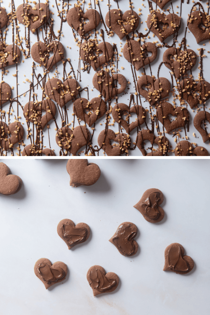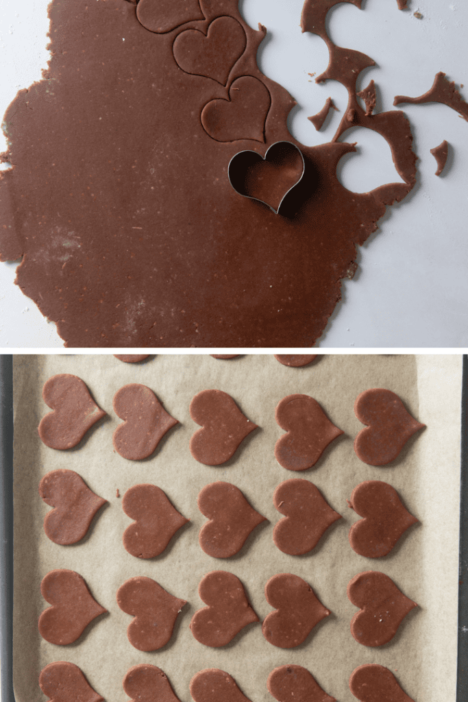 Heize den Backofen auf 170 °C Ober- und Unterhitze vor und bereite einige Backbleche mit Backpapier vor. Rolle den Teig ca. 3 mm dick aus und stich Herzen daraus aus. Versieh die Hälfte der Herzen mit einem kleinen Herz oder einem kleinen Loch.
