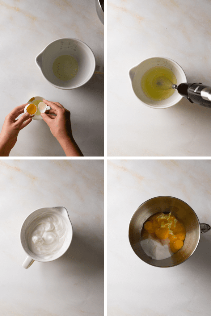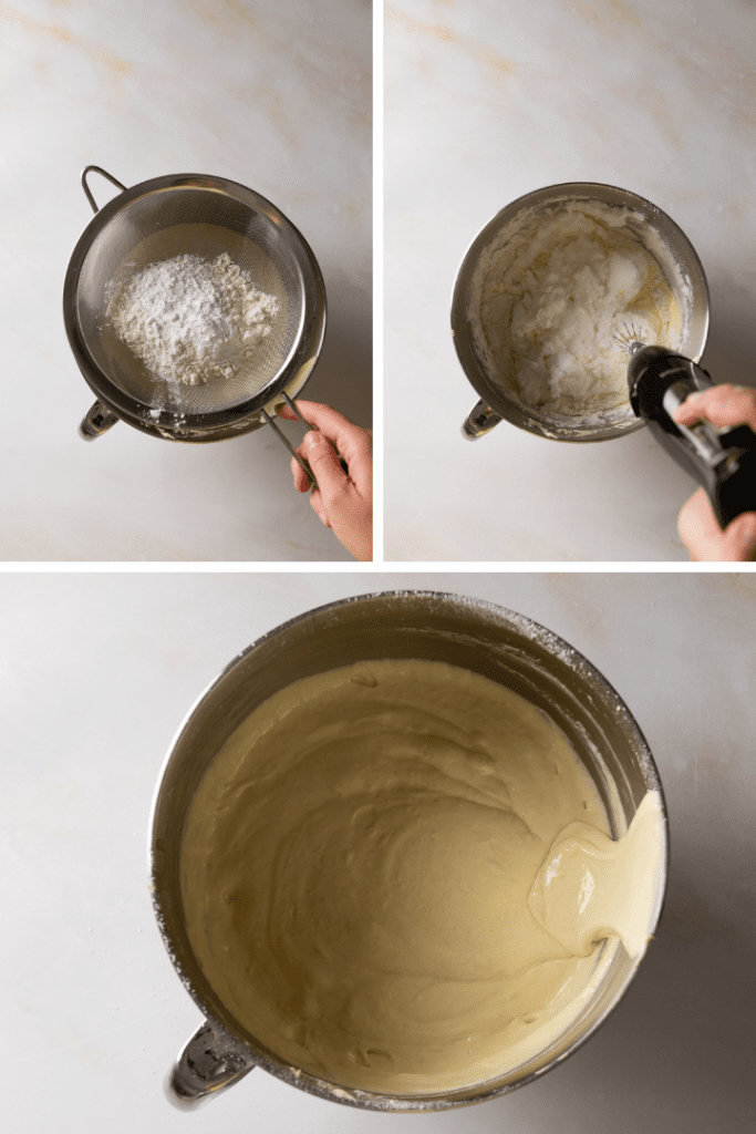Nun Weizenmehl, Speisestärke und Backpulver durch ein Sieb zur Eigelbmasse geben. Zunächst nur die Hälfte der Mehlmischung dazugeben und unterrühren. Die Hälfte des Eischnees zur Eigelbmasse geben und unterheben. Nun die restliche Mehlmischung unterheben und zum Schluss den übrigen Eischnee vorsichtig unterheben.