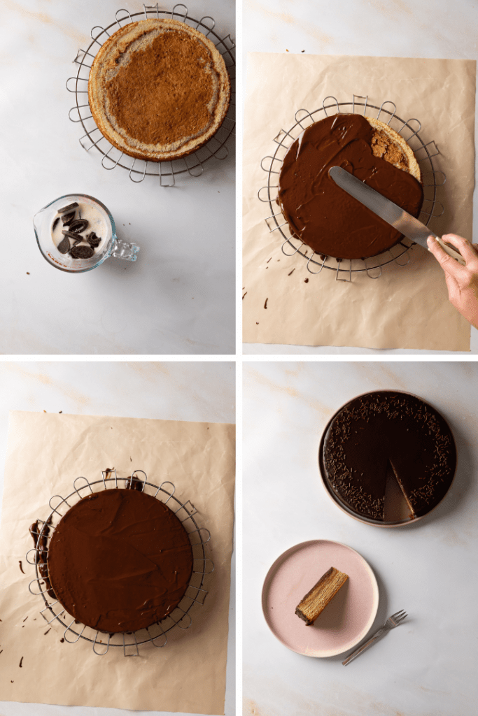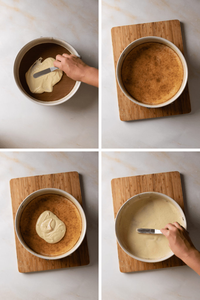 Hinweise zum Backen: Der Teig kann sehr schnell zu dunkel werden. Es wird ein paar Lagen brauchen, bis du die richtige Temperatur und die richtige Backzeit herausgefunden hast. Auch mit der Einschubhöhe im Backofen kannst du experimentieren. Am besten wirfst jeweils nach 2 Minuten einen Blick in den Backofen und entscheidest die weitere Backzeit anhand des Bräunungsgrades. Wenn der Kuchen in der Form höher wird, kann es sein, dass du den Kuchen eine Schiene tiefer in den Backofen stellen musst, um den Abstand zum Grill gleich zu halten. Falls eine Teigschicht zu dunkel gerät, ist das kein Problem. Mach einfach weiter mit dem Backen. Die dunkle Schicht sieht man später nicht und sie fällt auch geschmacklich nicht ins Gewicht.
