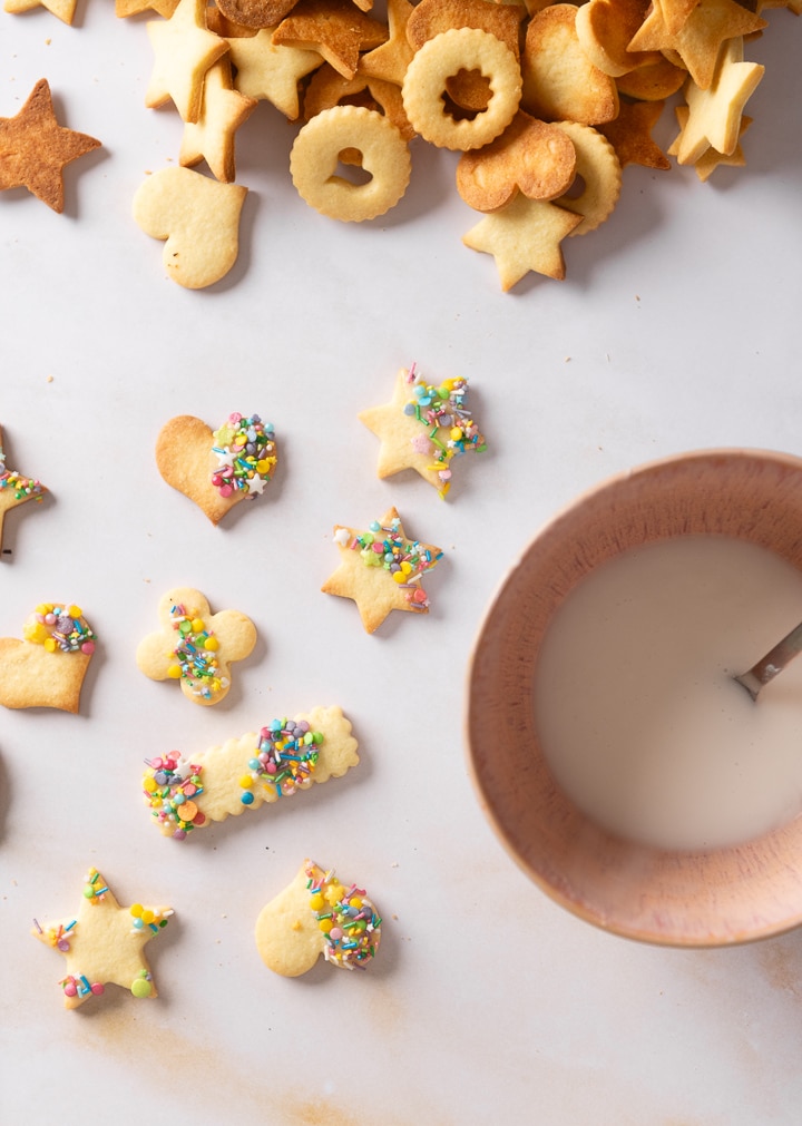 Puderzucker mit etwas Wasser zu einem cremigen Zuckerguss vermischen. Butterplätzchen mit Zuckerguss und Zuckerstreuseln dekorieren.