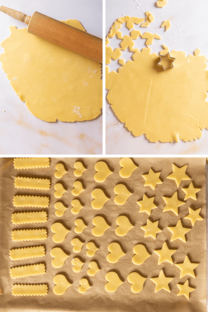 Backofen auf 170 °C Ober- und Unterhitze vorheizen. Teig in 5 gleich große Portionen teilen. Für die Butterplätzchen einen Teil ausrollen und mit verschiedenen Ausstechen Plätzchen ausstechen. Auf ein Backblech mit Backpapier legen und für etwa 10 – 15 Minuten backen.