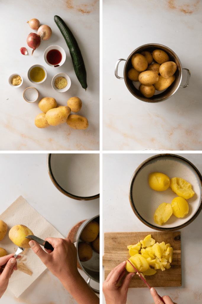 Kartoffeln in einen Topf geben, mit Wasser bedecken und etwa 25 Minuten garen. Anschließend, solange sie heiß bzw. sehr warm sind, schälen und in ca. 3 mm dicke Scheiben schneiden. In eine Schüssel geben.