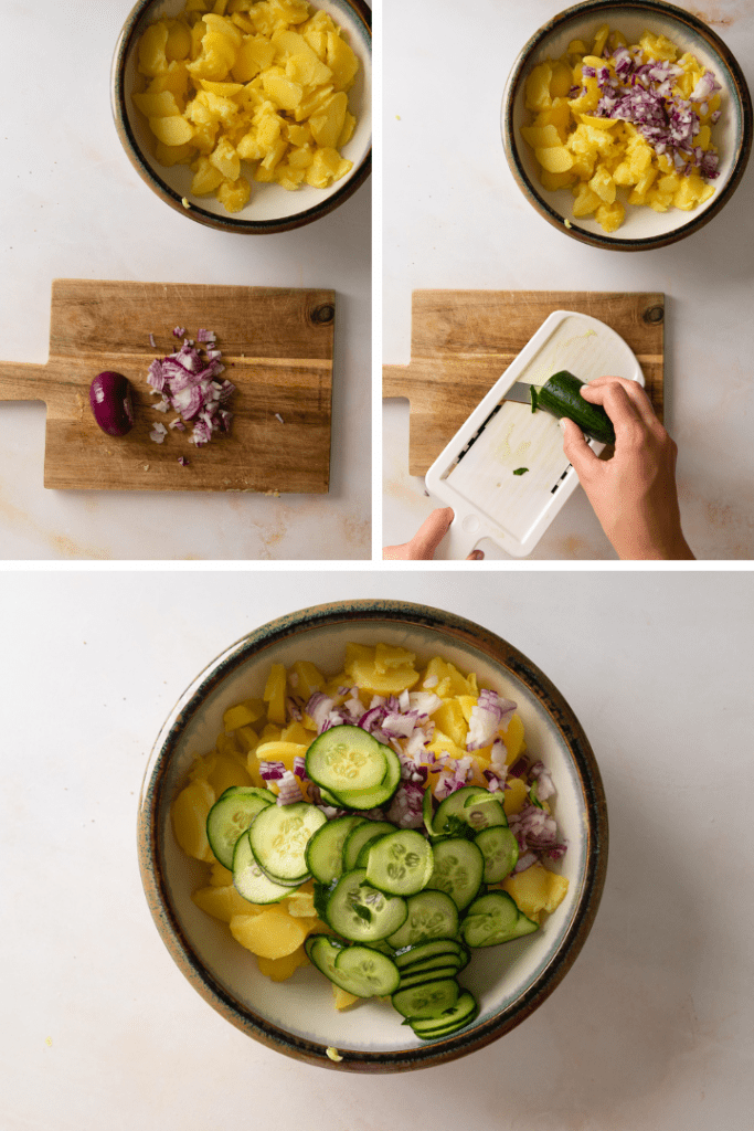 Zwiebel fein hacken und mit dazu geben, Gurke in feine Scheiben hobeln. Zu den Kartoffeln in die Schüssel geben.