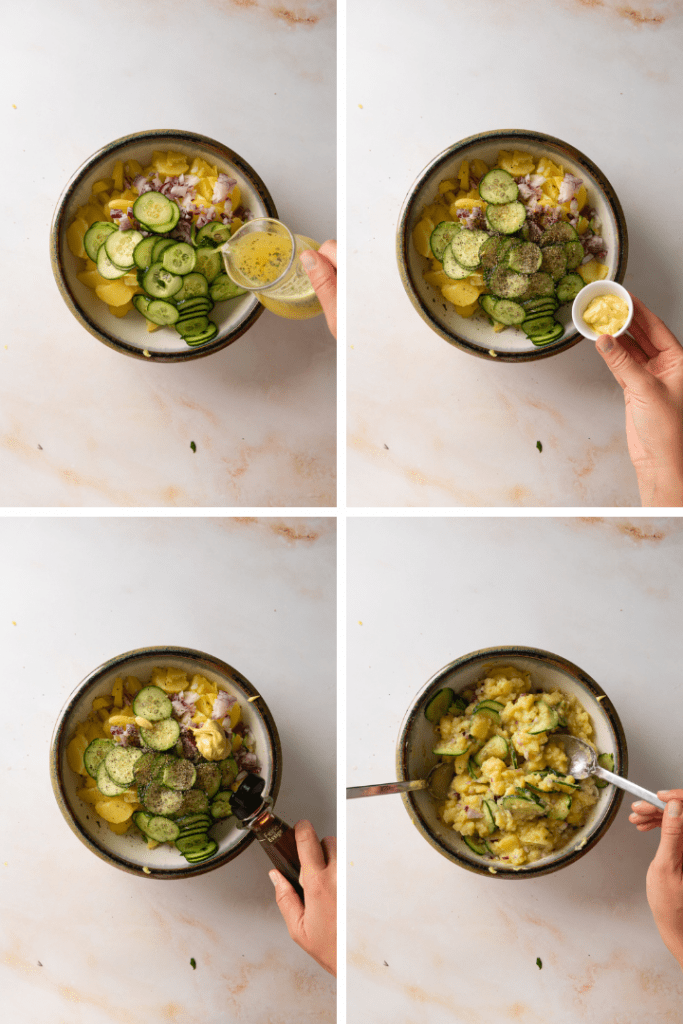 Gieße die heiße Gemüsebrühe auf. Vermenge die Zutaten vorsichtig und lass den Kartoffelsalat 10-15 Minuten ziehen. Vermenge derweil Senf, Essig, Öl, Salz und Pfeffer. Gib das Dressing zum Salat, vermenge sie Zutaten und lass den Kartoffelsalat erneut 20-30 Minuten ziehen. Mische den Kartoffelsalat dann vor dem Servieren nochmal gründlich durch und schmecke ihn würzig ab.