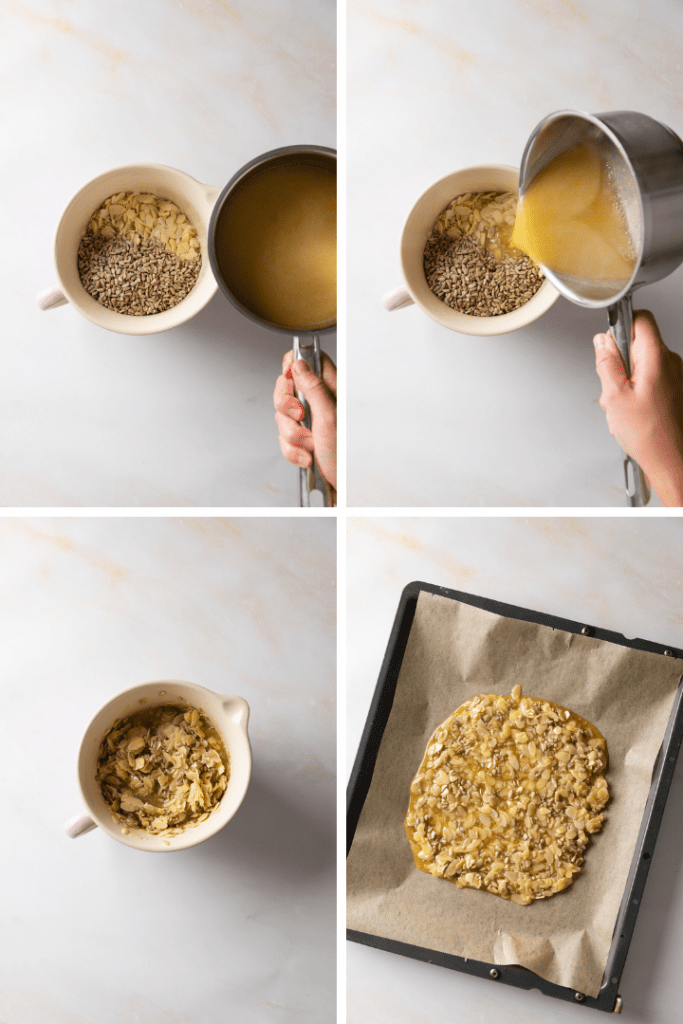 Zuckermischung in eine Rührschüssel geben, 200 g Mandelblättchen und 125 g Sonnenblumenkerne dazugeben und gut vermengen. Mischung dann auf ein Backblech gießen.