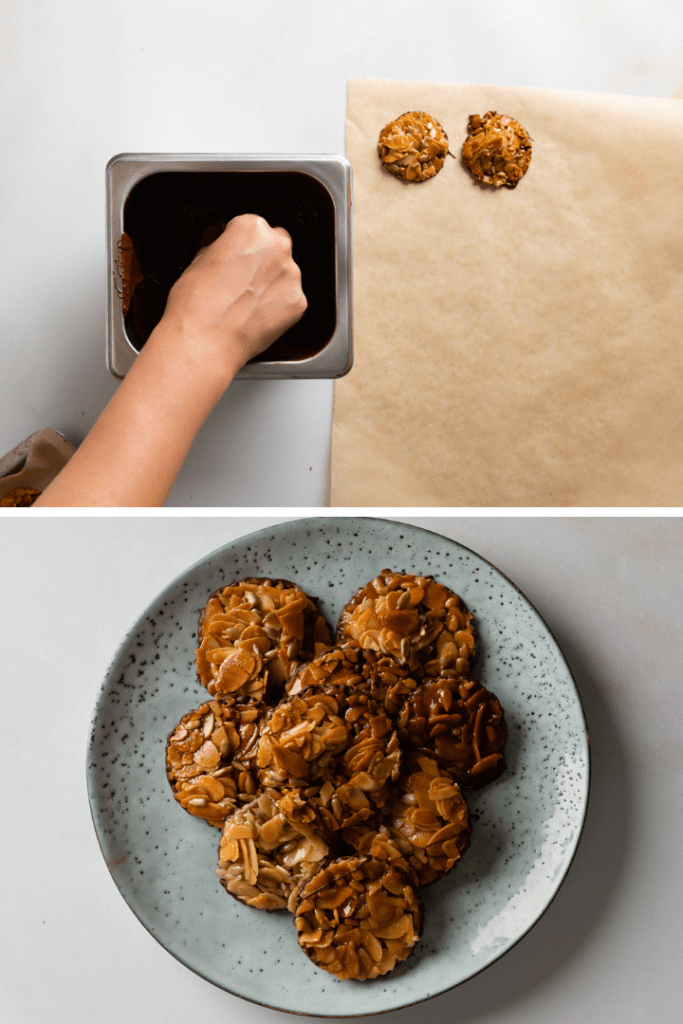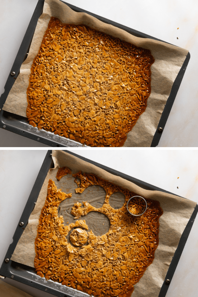 Im vorgeheizten Backofen bei 170 °C etwa 15 Minuten backen, bis die Masse goldbraun geworden ist. Die Florentiner-Platte dann etwas abkühlen lassen und mit verschieden großen runden Ausstechern daraus Kreise ausstechen.