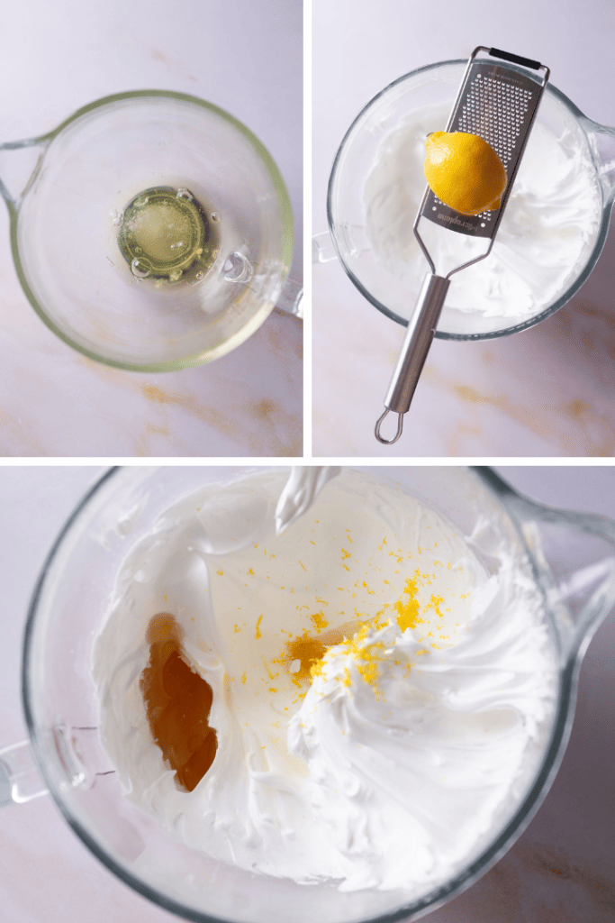 Backofen auf 160 °C Heißluft vorheizen. Mehrere Backbleche mit Backpapier auslegen. Die Eiweiß in einer sauberen Rührschüssel mit dem Zitronensaft vermischen und mit dem Handrührgerät oder der Küchenmaschine steif aufschlagen. Dabei nach und nach den Zucker einrieseln lassen. Eischnee so lange aufschlagen, bis sich sämtliche Zuckerkristalle aufgelöst haben. Dafür gelegentlich etwas Eischnee zwischen Daumen und Zeigefinger zerreiben. Sind keine Zuckerkristalle mehr zu spüren, ist der Eischnee perfekt.