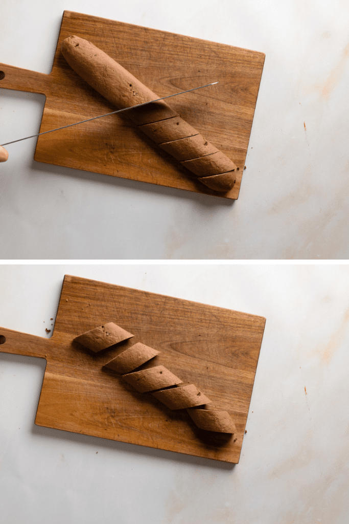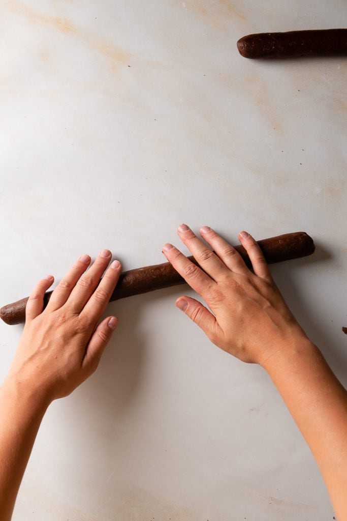 Nach der Ruhezeit den Teig in mehrere Portionen aufteilen und jeweils zu einem Teigstrang mit ca. 3-4 cm Durchmesser rollen. Je nach Länge deiner Backbleche werden es ca. 4-7 Teigstränge.