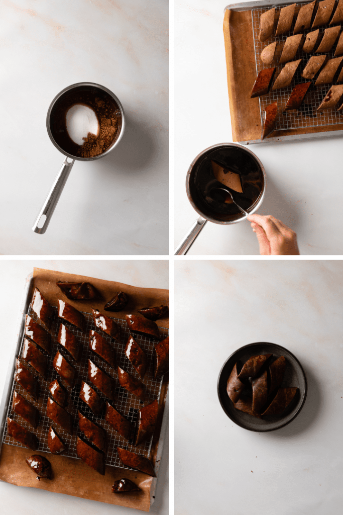 Für die Glasur alle Zutaten in einen Topf geben, kurz erwärmen, bis Schokolade und Butter geschmolzen sind. Die Magenbrotstücke dann in der Glasur tunken. Auf einem Gitter kurz abtropfen lassen, dann auf ein kaltes Blech mit Backpapier umsetzen und trocknen lassen.