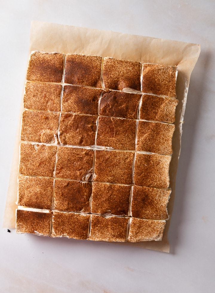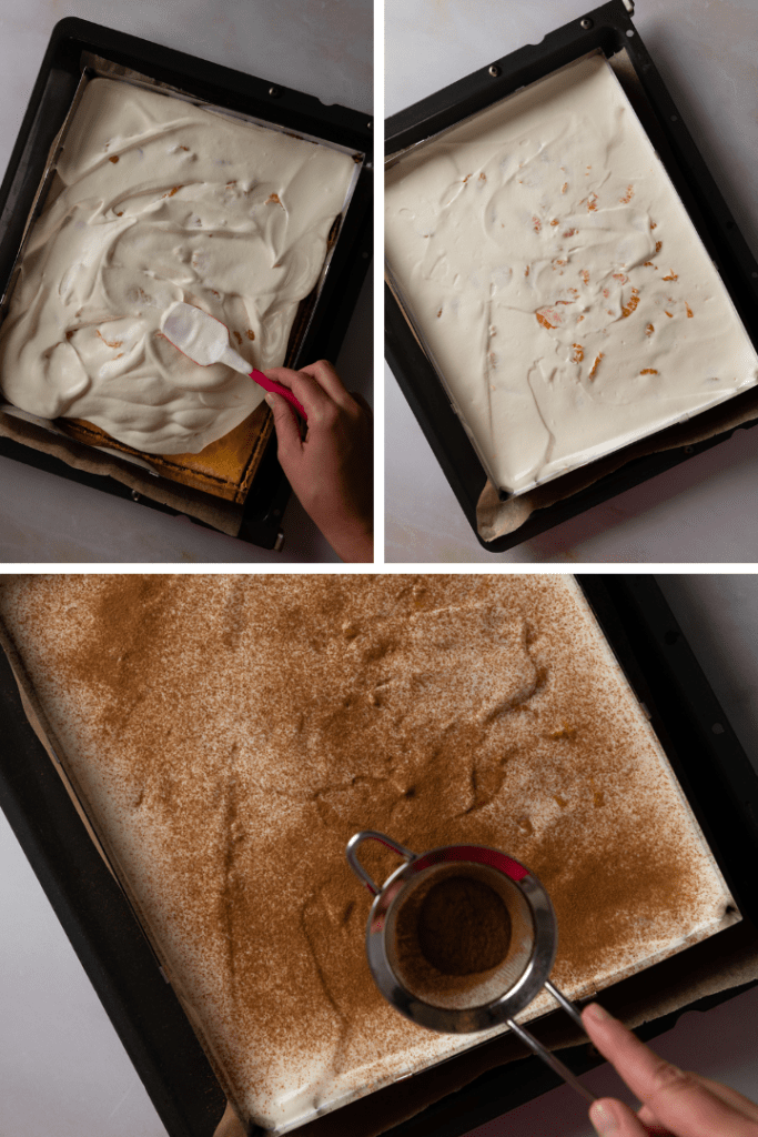 Die Creme dann auf dem abgekühlten Kuchenboden verteilen. Glatt streichen und mit Zimt bestreuen. Vor dem Anschneiden muss der Kuchen mindestens 4 Stunden, besser über Nacht, im Kühlschrank durchziehen.
