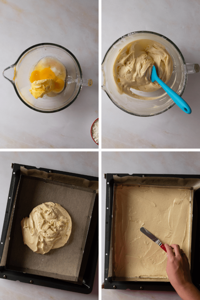 Backofen auf 170 °C Ober- und Unterhitze vorheizen. Ein Backblech mit Backpapier auslegen. Wer möchte, kann zusätzlich einen Backrahmen verwenden, das ist aber kein Muss.