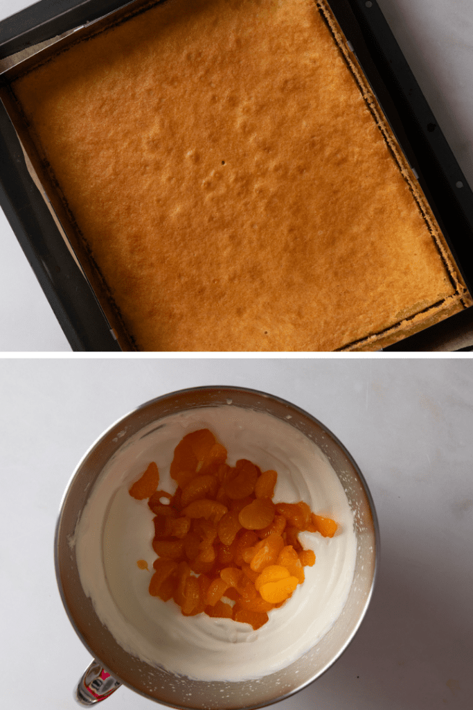 Den Kuchen komplett abkühlen lassen. Erst dann die Creme zubereiten. Dafür Schmand, Schlagsahne und Puderzucker in eine Rührschüssel geben und mit dem Handrührgerät oder der Küchenmaschine zu einer luftigen, steifen Creme aufschlagen. Die Mandarinen abgießen und vorsichtig unter die Creme heben.