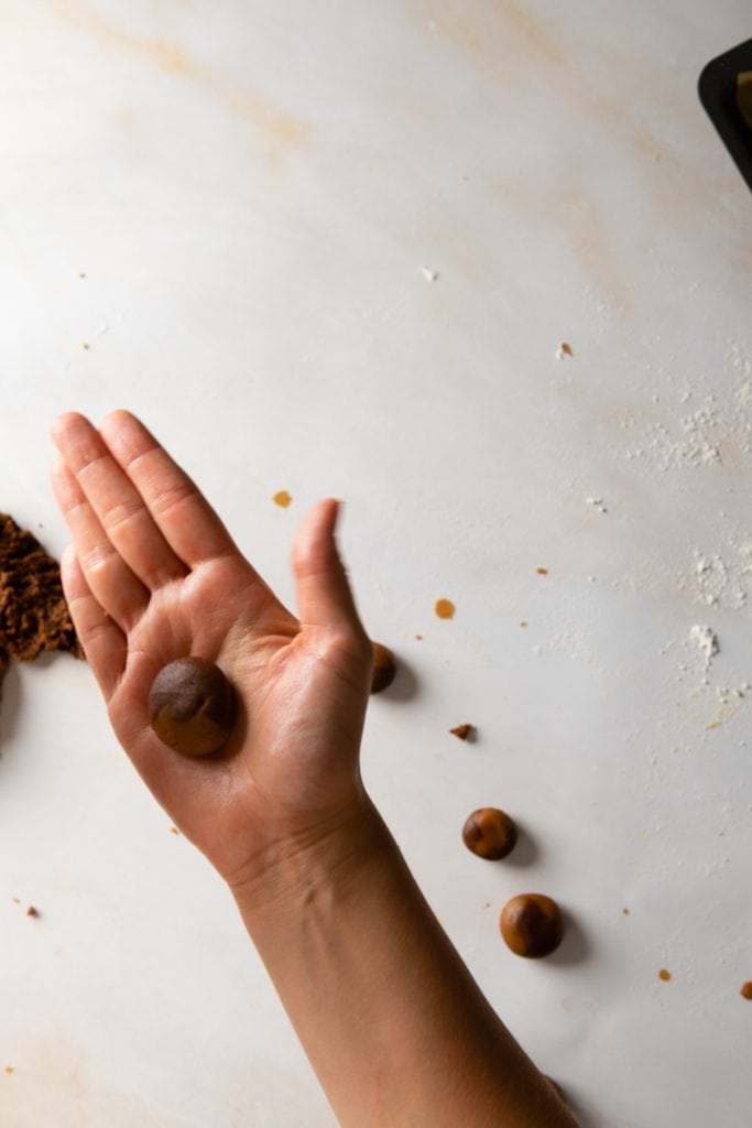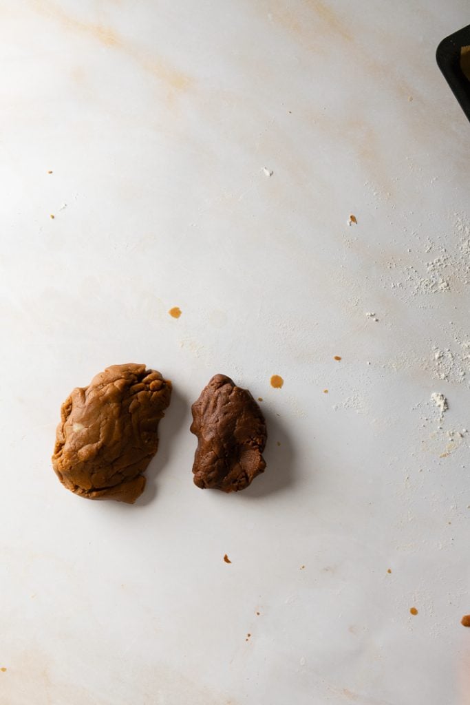 ⅕ des Teiges in zwei Portionen teilen. In eine Portion 5 g Backkakao einkneten. Dann jeweils eine haselnussgroße Portion des hellen und des dunklen Teiges nehmen und mit den Händen zu einer Kugel rollen. So mit dem gesamten Teig verfahren. Mein Tipp: Wenn du hellen Teig vom Butterplätzchen backen übrig hast, kannst du diesen zusätzlich für diese Plätzchen verwenden und den Effekt verstärken.