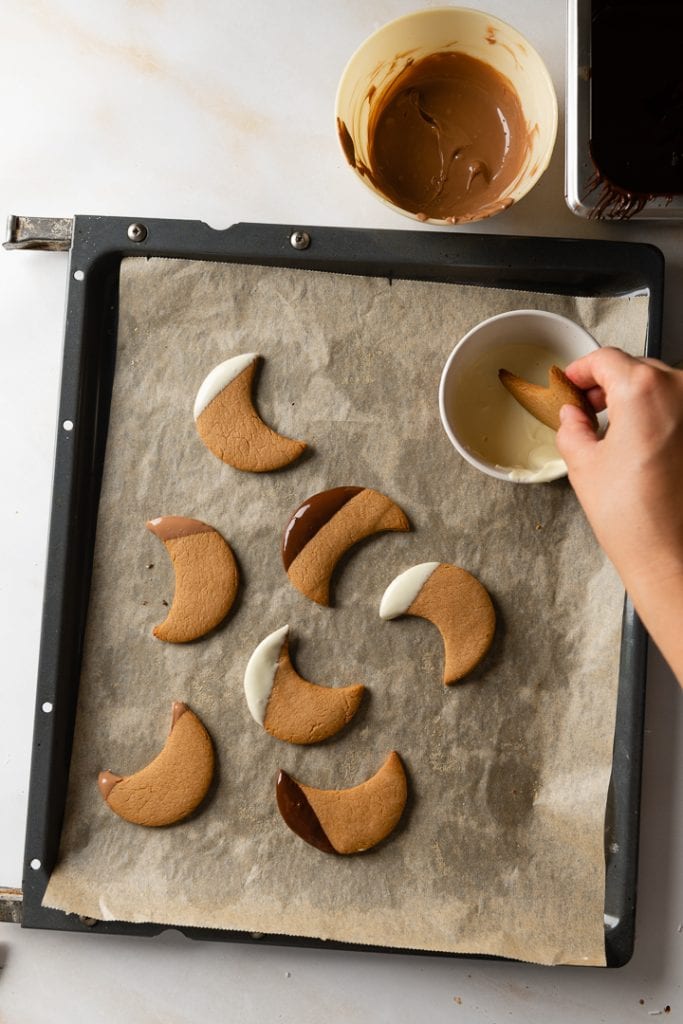 Die abgekühlten Monde in Zartbitter, Vollmilch und weiße Schokolade tunken. Trocknen lassen, dann in einer Keksdose lagern.