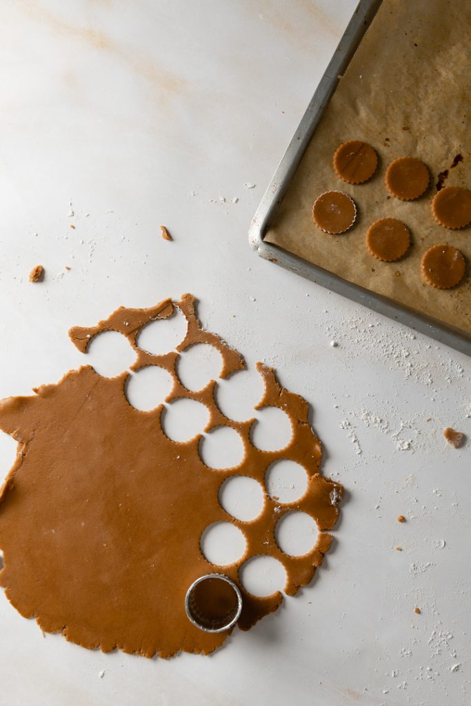 ⅕ des Teiges mit etwas Mehl ca. 2-3 mm dick ausrollen. Kleine Taler mit ca. 3 cm Durchmesser daraus ausstechen. Die Taler auf ein Backblech setzen und im vorgeheizten Backofen ca. 10 Minuten backen, bis die Taler an den Rändern goldbraun werden.