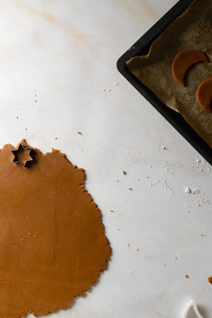 ⅕ des Teiges mit etwas Mehl ca. 2-3 mm dick ausrollen und Sterne daraus ausstechen. Die Sterne auf ein Backblech mit Backpapier setzen und im vorgeheizten Backofen ca. 10 Minuten backen, bis die Ränder goldbraun werden.