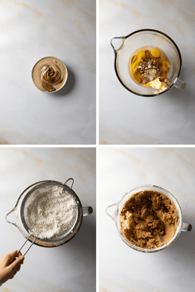 Für den Teig zunächst das Nougat in der Mikrowelle oder auf dem Wasserbad schmelzen. In einer Rührschüssel Butter, Puderzucker und Ei vermengen. Das geschmolzene Nougat, Vanilleextrakt und Salz hinzufügen, kurz unterrühren, dann Mehl und Backpulver dazusieben und zu einem geschmeidigen Teig kneten. Den Teig zur Kugel formen und für mindestens eine Stunde besser über Nacht im Kühlschrank ruhen lassen.
