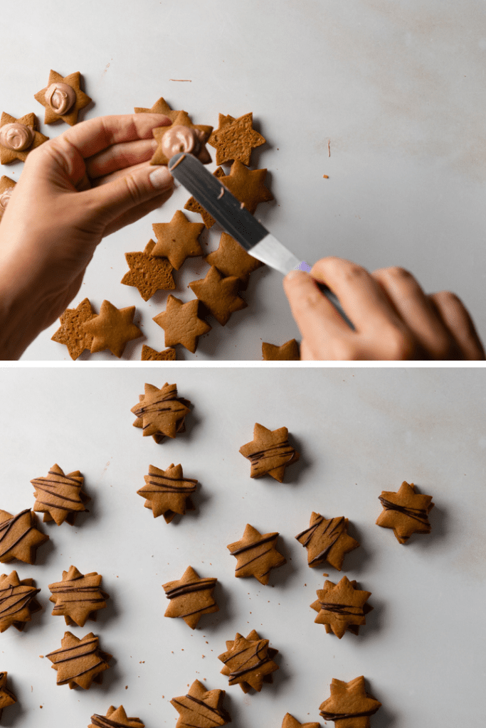 Sterne abkühlen lassen. Dann ca. 100 g Nougat schmelzen und je zwei Sterne mit einem Klecks Nougat zusammen kleben. Die Sterne nach Wunsch mit Schokoladenschlieren versehen, trocknen lassen und dann in eine Keksdose legen.