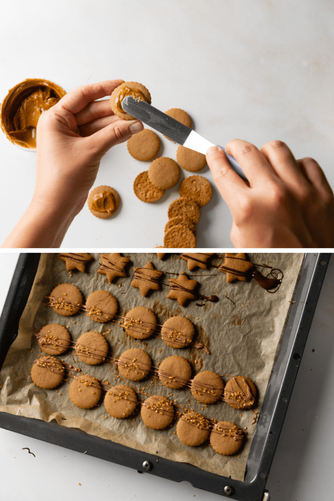 Die Taler abkühlen lassen, dann je zwei Taler mit einem Klecks Salted Caramel oder Dulce de Leche zusammen kleben. Die Taler dann mit etwas Vollmilchschokolade und goldenen Streuseln dekorieren. Trocknen lassen und in einer Keksdose lagern.