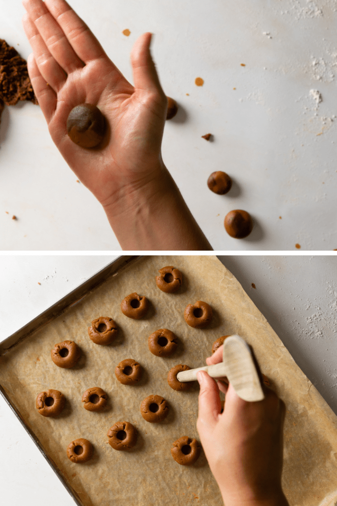 ⅕ des Teiges zu einem Teigstrang mit ca. 3 cm Durchmesser rollen. In etwa 2 cm große Teile schneiden. Jedes Teil zur Kugel rollen und mit etwas Abstand auf ein Backblech setzen. Mit der Rückseite eines Kochlöffels jeweils eine Mulde in jede Kugel drücken. Nun im vorgeheizten Backofen ca. 10 Minuten backen, bis die Ränder goldbraun werden.