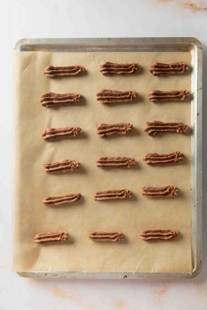 Fülle den Teig in den vorbereiteten Spritzbeutel und Spritze ca. 5 cm lange Teigstränge auf die Backbleche. Backe die Nougatstangen für ca. 12 Minuten im vorgeheizten Backofen bis sie sich vom Blech lösen.