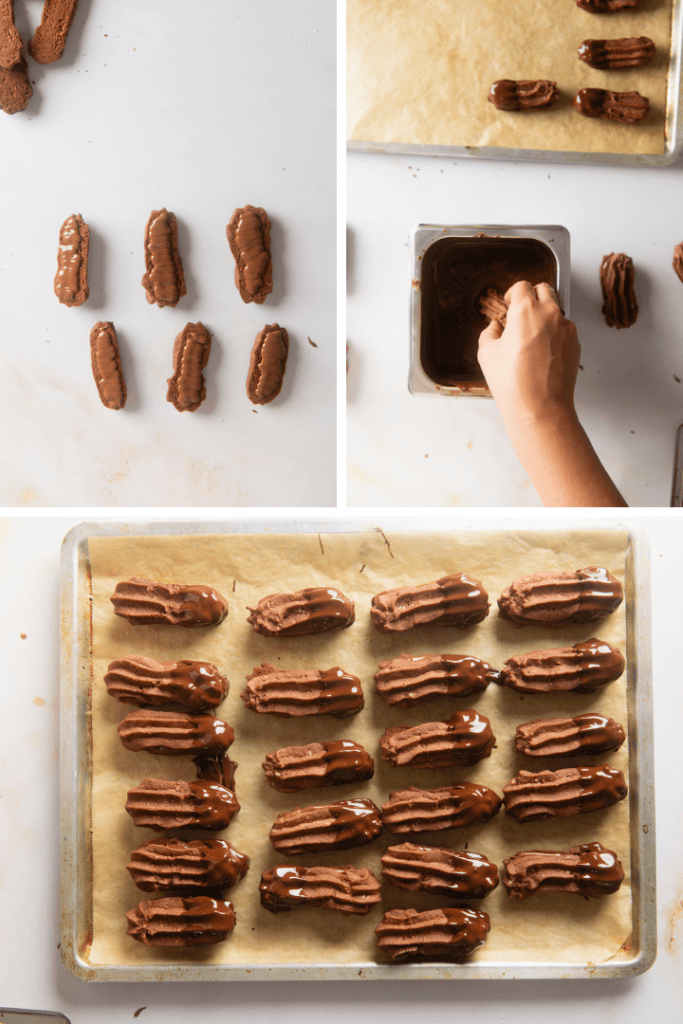 Bestreiche die Hälfte der Nougatstangen mit Nougat und lege je ein zweites Plätzchen darauf. Tunke jede Nougatstange zur Hälfte in geschmolzene Schokolade und lass sie vor dem Servieren gut trocknen.