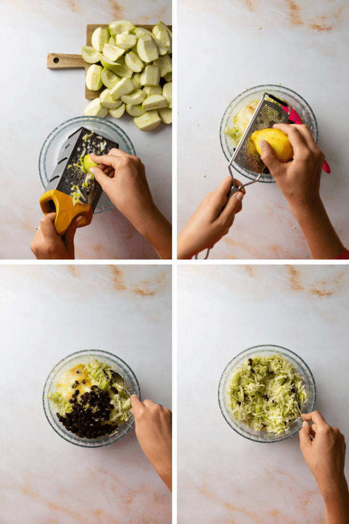 Äpfel waschen, vierteln und entkernen. Dann grob raspeln. Mit Honig, Vanilleextrakt und Rosinen vermengen. Diese Mischung zudecken und über Nacht im Kühlschrank ziehen lassen. Mein Tipp: Verwende für die Apfelmasse eine große Schüssel. So brauchst Du am nächsten Tag nur noch die restlichen Zutaten zufügen, um den Teig zuzubereiten.