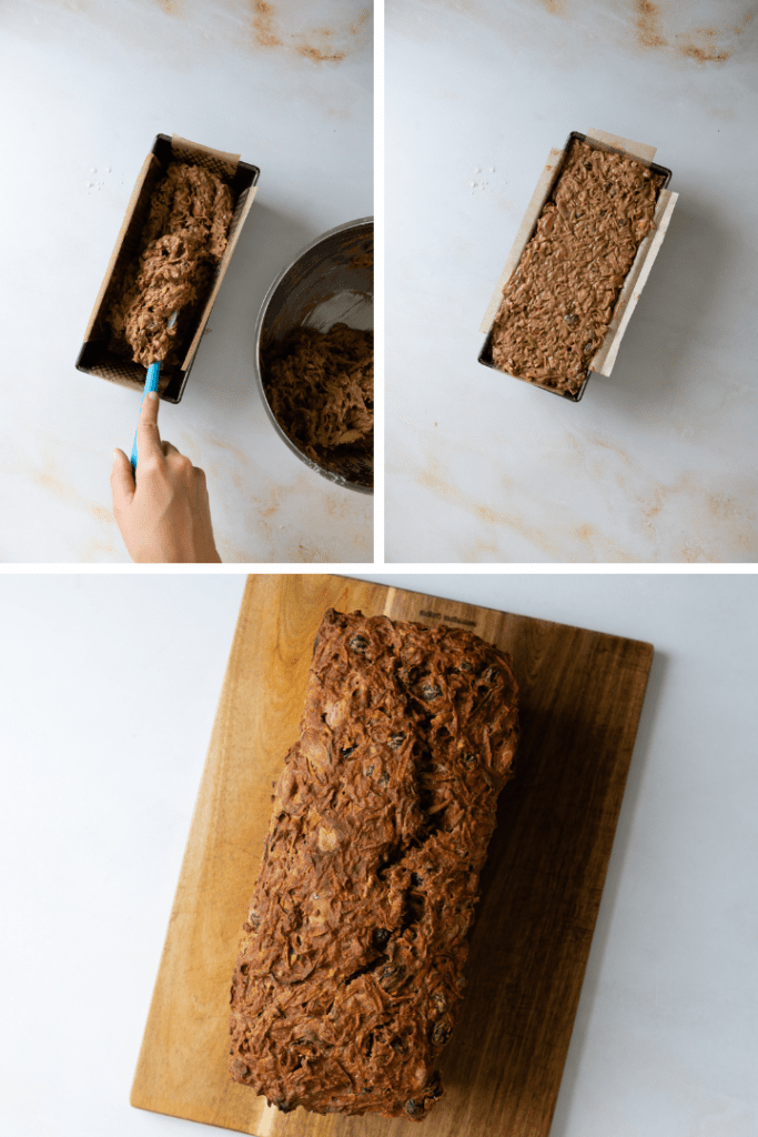 Den Teig in die vorbereitete Backform füllen. Glatt streichen und im vorgeheizten Backofen bei 170 °C Ober- und Unterhitze etwa 1 Stunde backen. Das Apfelbrot ist fertig, wenn es goldbraun ist und die Stäbchenprobe besteht.