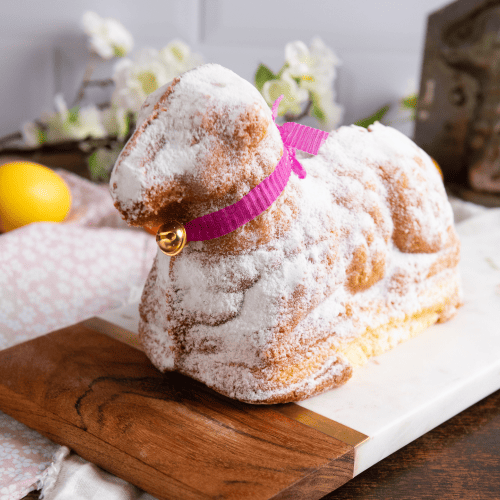 Schneide wenn nötig die Backkuppel vom Boden des Osterlamms ab und löse das Osterlamm vorsichtig mit Klopfen und behutsamem Anheben der Form aus selbiger. Lass das Osterlamm komplett abkühlen und bestreue es nach Belieben mit Puderzucker. Dekoriere es mit Glöckchen und/oder Schleifchen und lager es unter einer Tortenglocke oder decke es anderweitig gut ab.