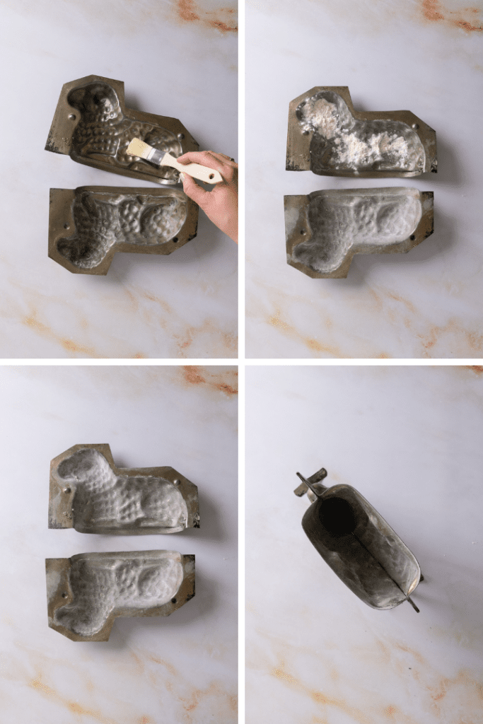 Backofen auf 170 °C Ober- und Unterhitze vorheizen. Die Backform für das Osterlamm gründlich mit Butter ausstreichen und mit Paniermehl oder Mehl auspudern. Die Form dann zusammenbauen und bereitstellen.