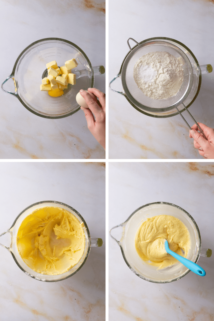 Für den Teig gibst du Butter, Eier und eine Prise Salz in eine große Rührschüssel. Siebe nun Zucker, Weizenmehl und Backpulver dazu. Gib das Vanilleextrakt hinzu und rühre aus den Zutaten mit dem Handrührgerät oder der Küchenmaschine einen glatten Teig. Wenn der Teig zu fest ist, gib noch etwas Milch dazu.