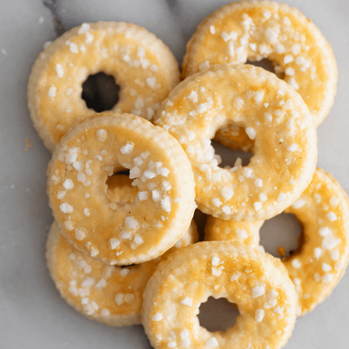 Heize den Backofen auf 170 °C Ober- und Unterhitze vor. Rolle den Teig für die Saure Sahne Plätzchen etwa 5 mm dick aus und stich Taler daraus aus. Streiche die Plätzchen mit verquirltem Ei ein und bestreue sie mit Hagelzucker. Die Teigreste kannst du ein zweites Mal ausrollen.