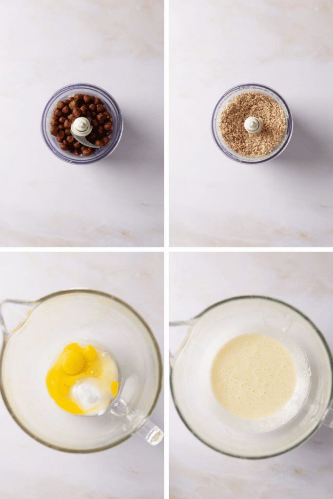 Heize den Backofen auf 170 °C Ober- und Unterhitze vor und lege einige Backbleche mit Backpapier aus. Mahle, ggf. die Haselnüsse. Gib Eier, Zucker, Vanille und Salz in eine Rührschüssel und vermenge die Zutaten kurz. Gib die Eier dazu und rühre sie unter.