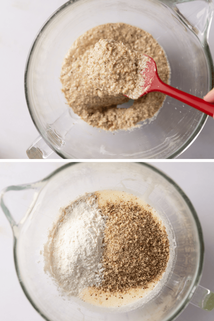 Gib die gemahlenen Haselnüsse, Zimt und Mehl in die Schüssel und verrühre alles zu einem glatten Teig.